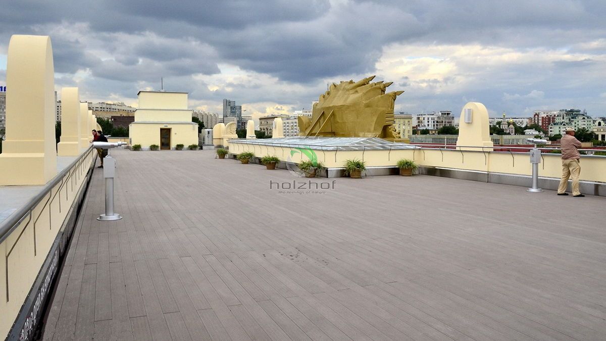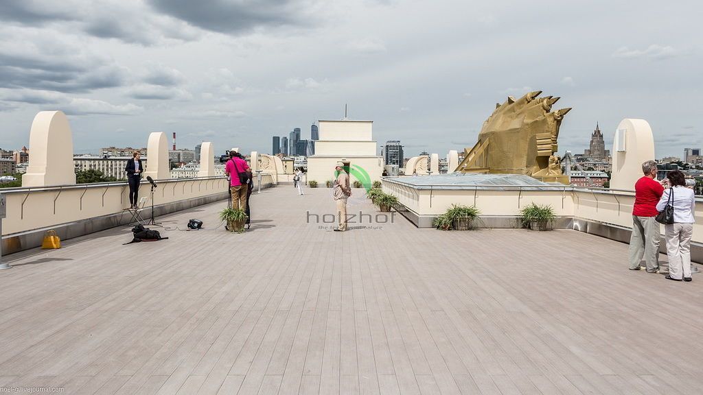 11 июня 2015 года было открыто после реставрации здание Главного входа в Парк Горького - легендарная арка на Крымском Валу, ставшая одним из символов Москвы, стала доступна для посетителей: в пилонах разместился Музей истории Парка Горького, а на крыше - смотровая площадка с видами на парк и город. Смотровая площадка на крыше Главного входа в Парк Горького находится на высоте 18 метров, её площадь составляет более 700 квадратных метров. При реставрации смотровой площадки была применена террасная доска Olympiya, которая отлично вписалась в общий экстерьер площадки, при этом обладая прекрасными свойствами по прочности и долговечности. Террасная доска не подвержена выгоранию, и крайне износоустойчива, что позволяет выдерживать перемены погодных условий и большой поток посетителей.
